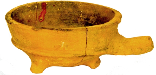 | 4b | vuurtest met ronde bak, scherpe knik bodem-wand, iets uitwijkende wand, poten |