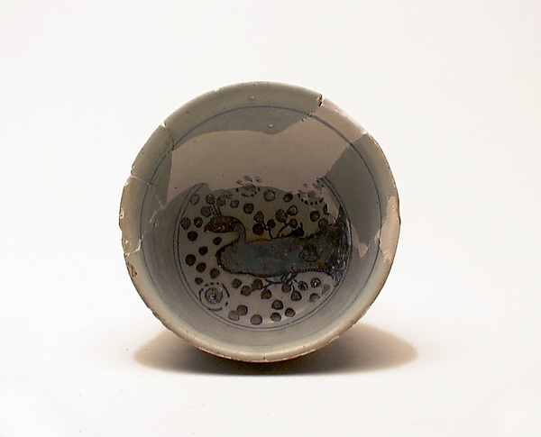 | 5c decoratie | binnenzijde: rand blauwe bies, spiegel dubbele bies plus pauw; buitenzijde: bies met geometrisch motief en bloemen blauw |