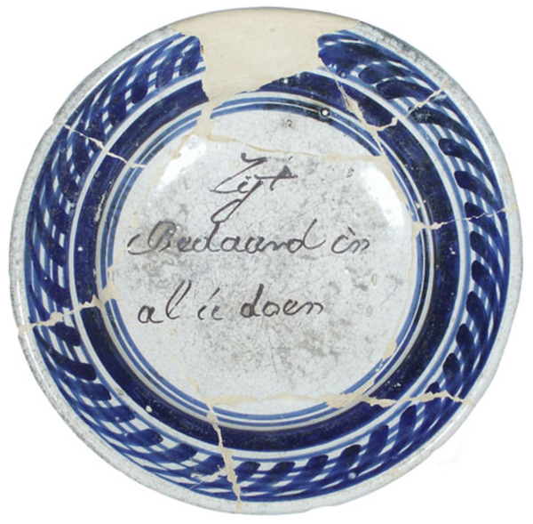 | 5c | vlag: concentrische cirkels en streepjes in blauw; spiegel: tekst in paars: ZIJT BEDAARD IN AL U DOEN inwendig: blauw en paars |