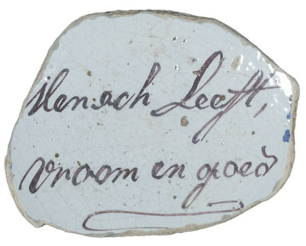 | 5c | spiegel: tekst in paars: MENSCH LEEFT, VROOM EN GOED inwendig: blauw en paars |