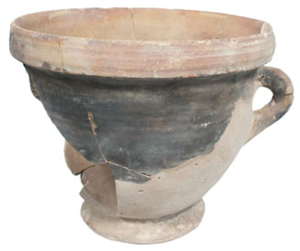 | 4b | bloempot met knik onderin de zijwand, brede geribde kraagrand, standring |