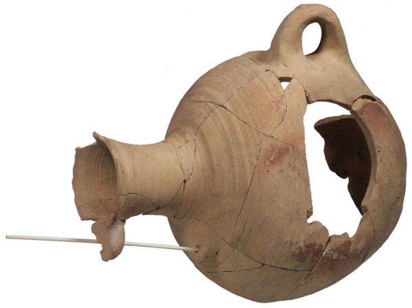 | 4b | peervormige spreeuwenpot met doorboorde nok voor stokje, roofgat aan afgeplatte zijde, met ophangoor |