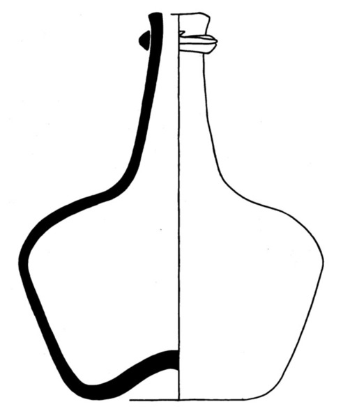 | 4b | bolvormige wijnfles met de grootste breedte aan de schouder en naar beneden sterk conisch, met V-vormige of afgeronde draad om de lip, opgestoken bodem met pontilmerk |