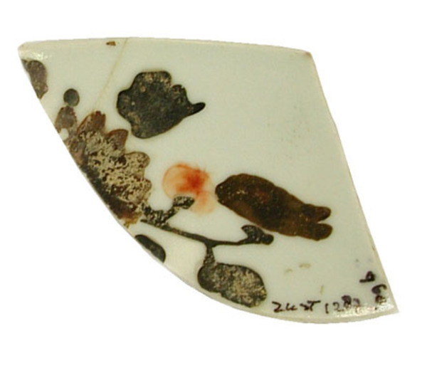 | 5c decoratie | in- en uitw. bovenglazuur bruin en zwart; bloemenstruik Japans boerenbont onderglazuur roze |