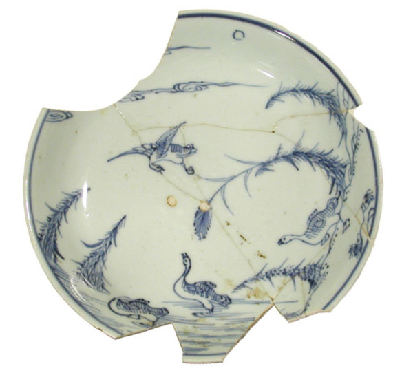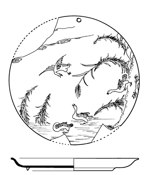 | 5c decoratie | inw: waterplas, vier eenden, riet, maan(?) onderglazuur blauw |
