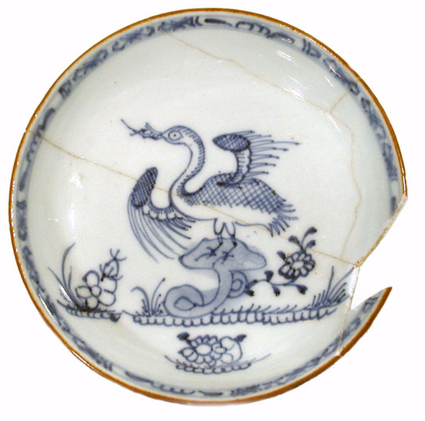 | 5c decoratie | zwaan met kikker op rots (?) aan vijver, langs rand kruisjesband onderglazuur blauw |