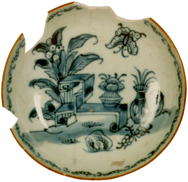 | 5c decoratie | inwendig: landschap met voorwerpen en vlinder binnen ornamentaal randje; roodbruin randje onderglazuur blauw, bruin |