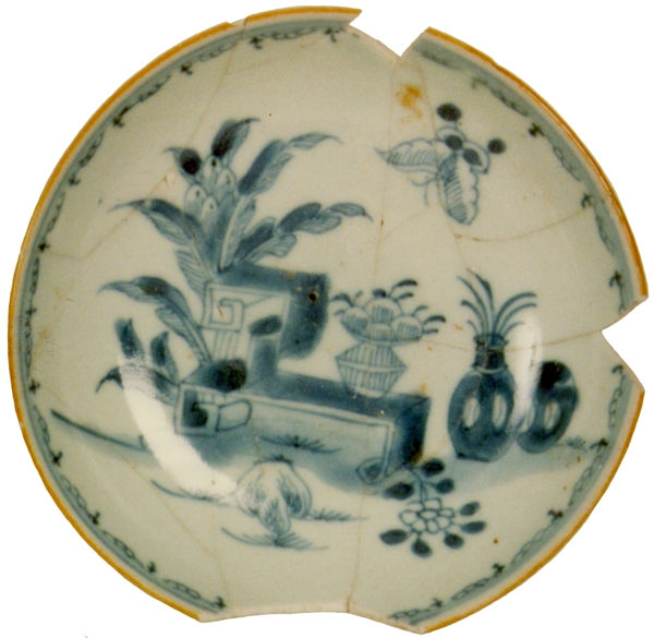 | 5c decoratie | inwendig: landschap met voorwerpen en vlinder binnen ornamentaal randje; roodbruin randje onderglazuur blauw, bruin |