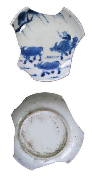 | 5c | landschapje: koeiendrijver met drie runderen onderglazuur blauw |