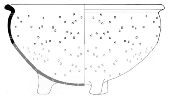 | 4b | bol vergiet met korte uitstaande rand en ingesnoerde hals, verdikte afgeronde rand, drie poten |