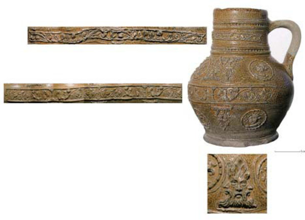 | 5c decoratie | appliques: portretbustes (narrenkoppen), acanthusbladeren (uitgewerkt tot baardmanmasker met drie gezichten) en ornamentale banden met floraal motief (op hals binnen banen met radstempel) |