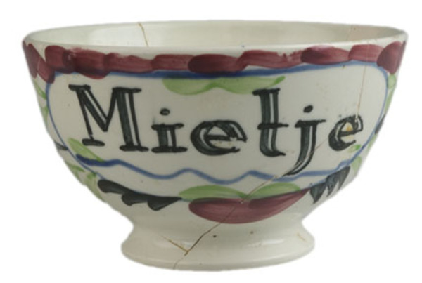| 5c decoratie | uitw: binnen ovale lijst in blauw staat een naam in zwart, in golflijn en blaadjes is rondom het ovaal een versiering aangebracht in bordeaux rood, groen en zwart; tekst: Mietje polychroom |