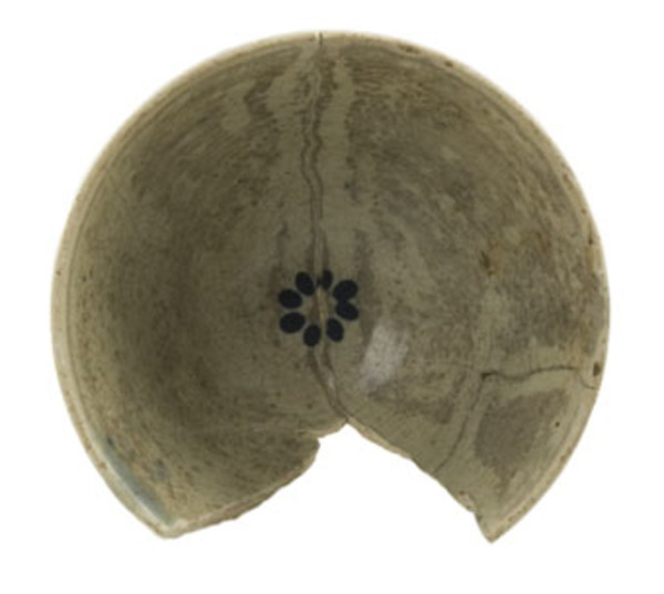 | 5c | decoratie in blauw en bovenglazuur geel en rood; inw: op de bodem een bloem van acht stippen; uitw: onder rand filet, daaronder drie bloemtakken, rode knop en bloem van acht stippen met geel hart polychroom |