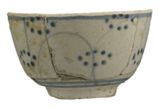 | 5c decoratie | inw: onder rand filet, op bodem ovaal van acht stippen; uitw: tussen filet onder rand en dubbel filet rond standring zijn zes bogen die versierd zijn met ovalen van acht stippen blauw |