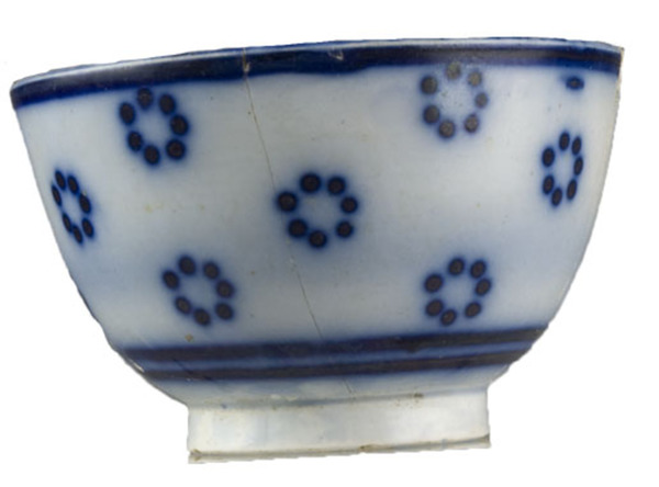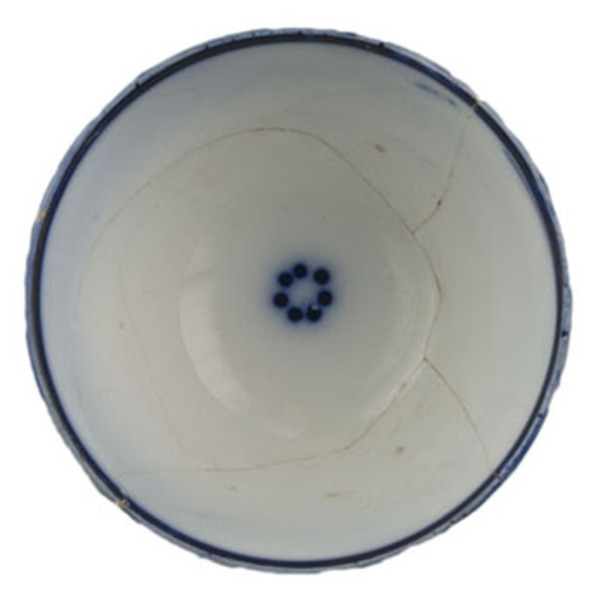 | 5c decoratie | inw: in vloeiblauw: onder rand filet, op bodem cirkel van 7 stippen; uitw: tussen filet onder rand en dubbel filet boven standring staan twee rijen cirkels die uit stippen zijn opgebouwd blauw |