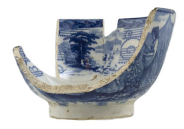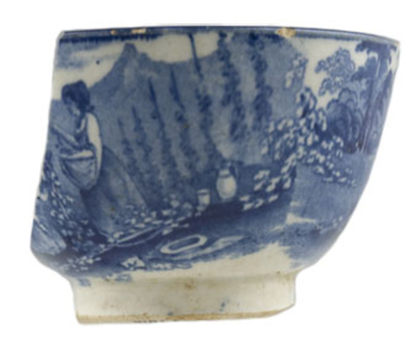 | 5c | inw: breed geometrisch filet met landschap medaillons waarin twee personen, spiegel: vrouw in hopplantage, uitw: twee maal een afbeelding met twee vrouwen in hopplantage blauw |