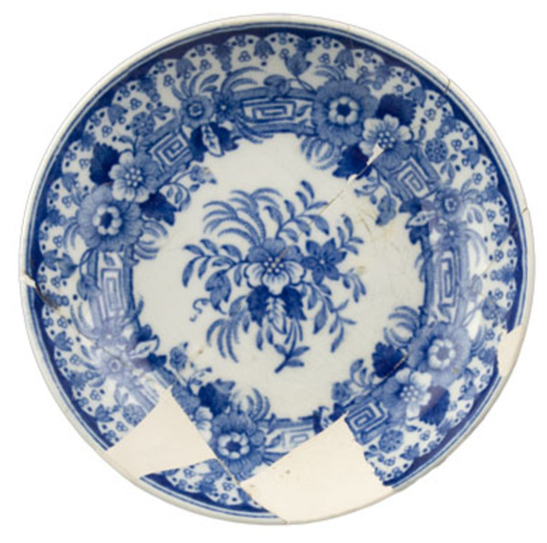 | 5c decoratie | inw: onder rand filet, vlag: breed filet met geometrisch motief en bloemen; spiegel: bloemen en bladeren rozet blauw |