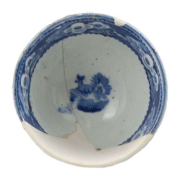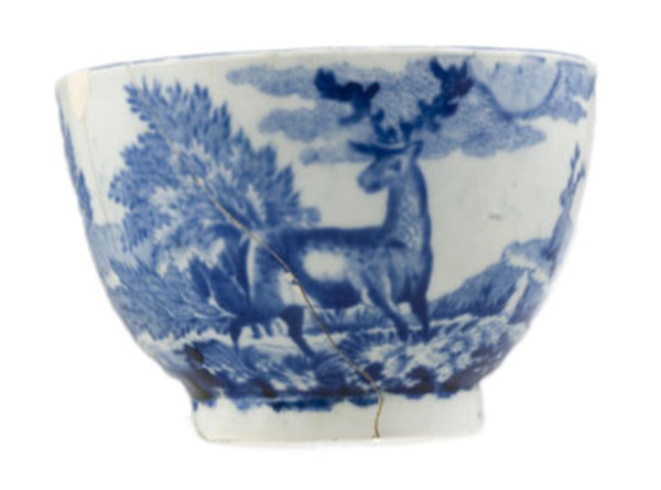 | 5c decoratie | inw: onder rand breed bloemenfilet, op bodem hert in landschap; uitw: herten in landschap, een groot hert op de voorgrond blauw |