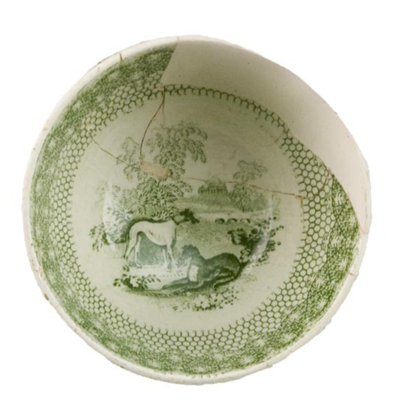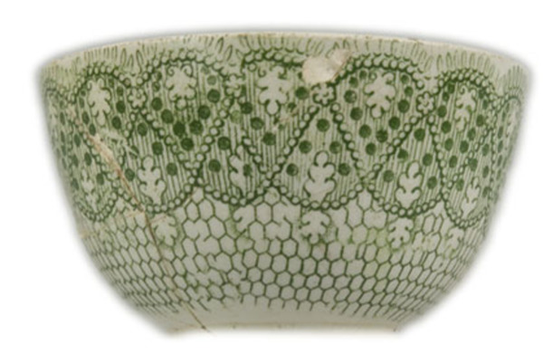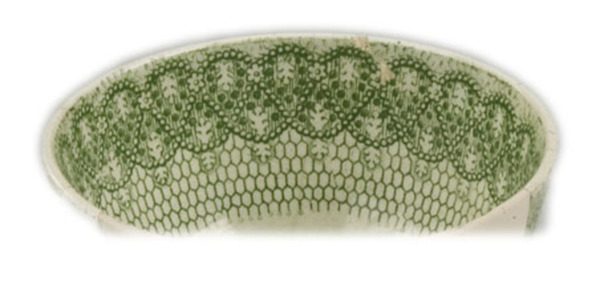 | 5c decoratie | inw: onder rand gedetailleerde kabellijn met daaronder honingraatmotief, op bodem twee hazewindhonden; uitw: gedetailleerde kabellijn met daaronder honingraatmotief groen |