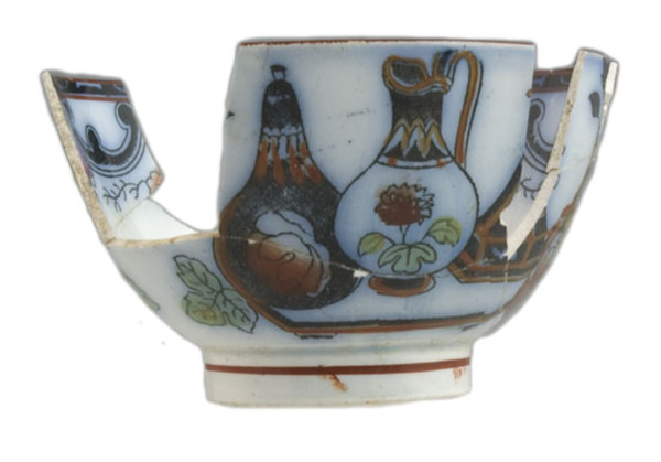 | 5c | rood en geel in bovenglazuur, inw: onder rand filet met takken en bladeren, op bodem bloementak; uitw: drie vazen en bloemen, rood filet op standring polychroom |
