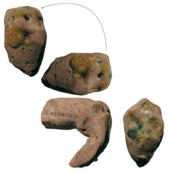| 5c | eenvoudig geboetseerd gezicht, geaccentueerd met witte sliblaag en groen gevlekt loodglazuur (strooiglazuur met koperoxide) |