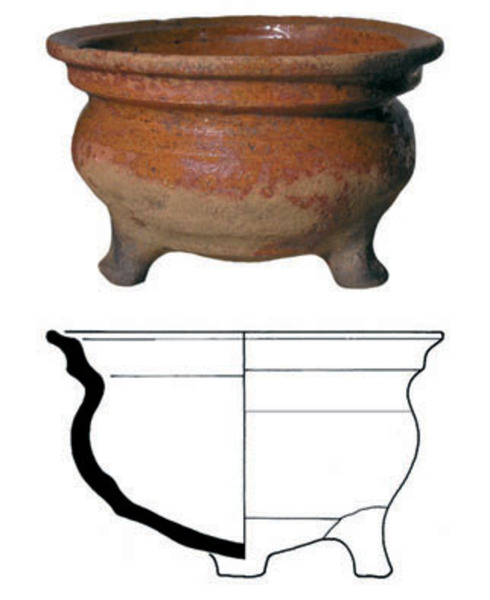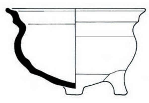 | 4b | bolle kom met ingesnoerde hals, manchetrand met dekselgeul, poten |