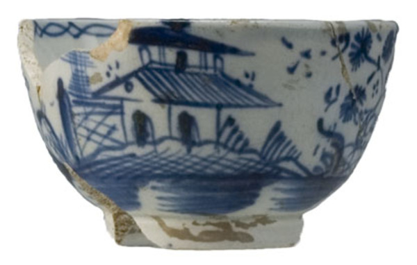 | 5c | handbeschilderd; inwendig: dubbele meanderlijn onder rand, op bodem strepen; uitwendig: imitatie Chinees landschap blauw |