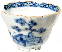 | 5c decoratie | uitwendig: landschap met boom onderglazuur blauw |