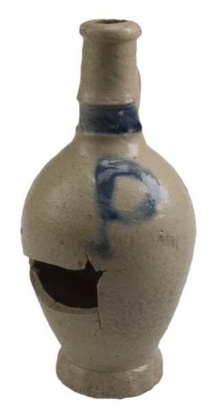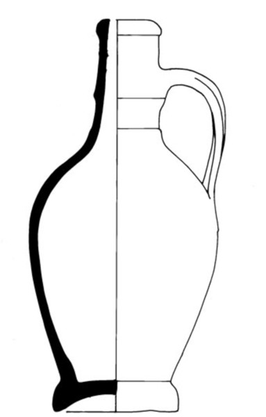 | 4b | P-kruik: iets bolle fles met cilindrische nek en verdikte lip, ribbels op hals, standvoet |