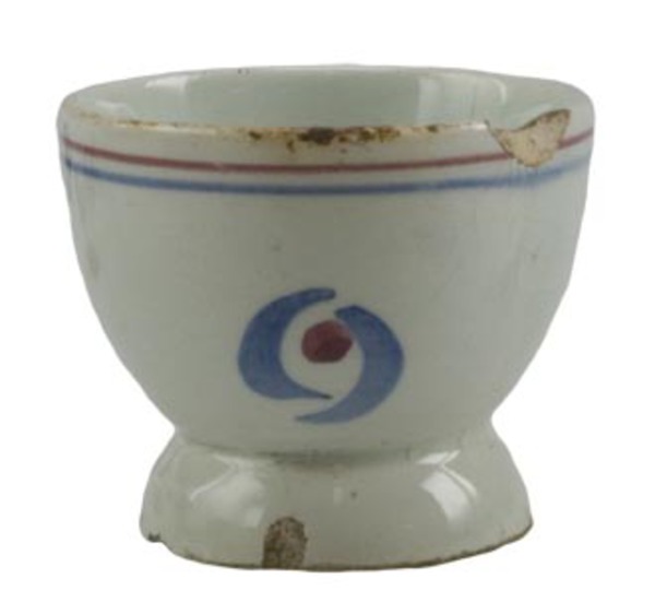| 5c decoratie | rood en blauwe filet onder rand; rood en blauw symbool op wand |