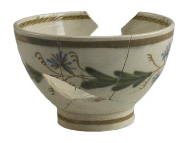| 5c decoratie | inwendig en uitwendig: bloem en blad in bruin en groen tussen twee filets in goud |