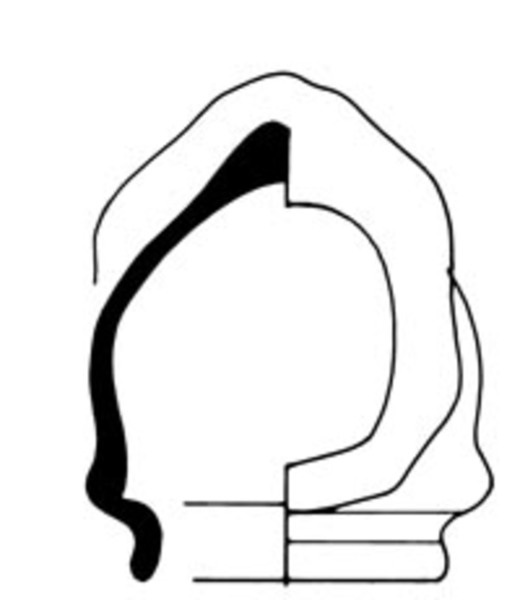 | 4b | puntig loefkapje met bol middenstuk, open onderzijde en twee uitlopende hoornvormige eveneens open zijkanten tegenover elkaar (symmetrisch) |