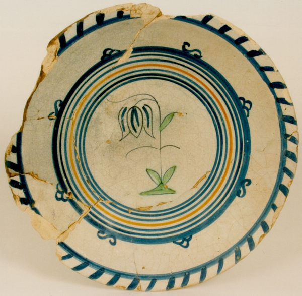 | 5c | decoratie in groen, blauw, paars en oranje, vlag: cirkels en kabelrand; spiegel: tulp op grondje inwendig: polychroom |