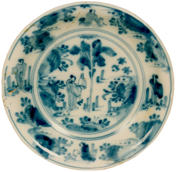 | 5c | vlag: Chinezen in landschap (de decoratie is ontleend aan overgangsporselein); spiegel: Chinees met vaas in landschap blauw |