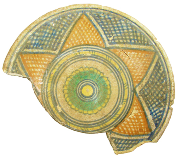 | 5c decoratie | gestileerd bloemrozet binnen eveneens gestileerde bloembladeren inwendig: polychroom |
