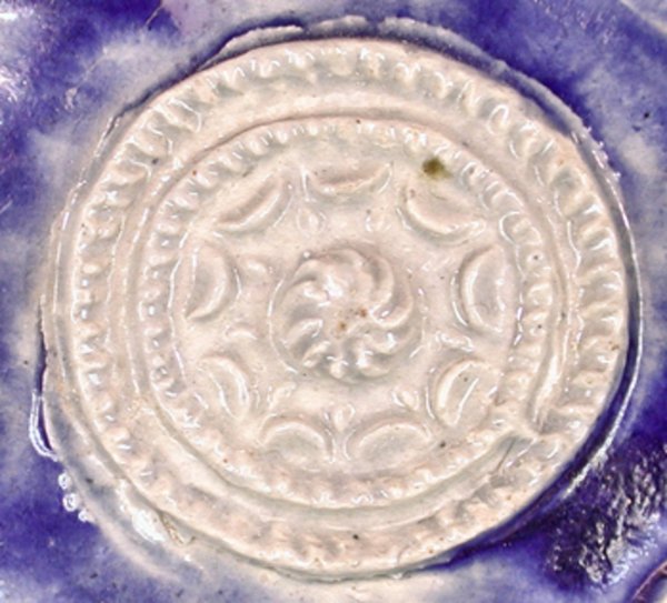 | 5c decoratie | ronde appliques op buik / "kabel-kabel-sikkelrand-madelief" / ribbelversiering op hals, standvoet en oor krul bij ooraanzet |