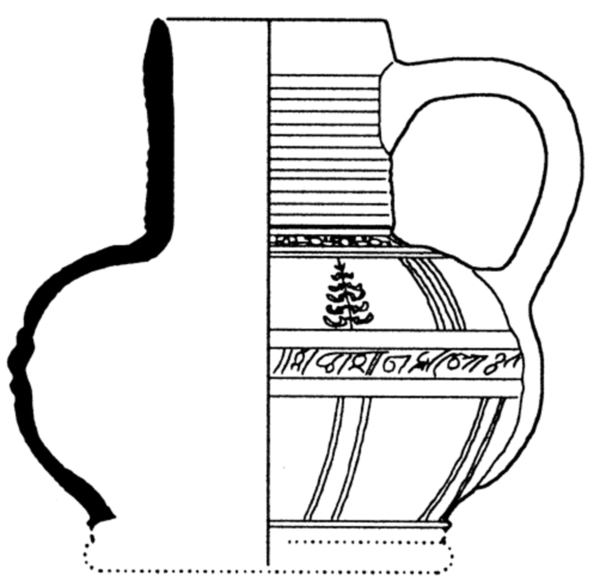 | 5c decoratie | band met floraal motief op de buik, band met bloemstempels op de overgang naar hals, panelen met floraal motief |