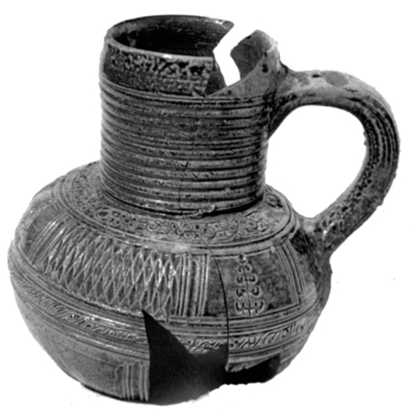 | 4b vorm | kan met kogelronde buik en cilindrische hals met bundels ribbels op de hals, uiteenlopende decoraties, soms tweedeling van de buik, standvoet |