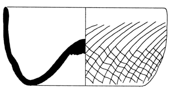 | 4b | lage cilindrische licht buikige maigelein met gekruist ribbelpatroon of naar links of rechts draaiend ribbelpatroon, opgestoken bodem met pontilmerk |