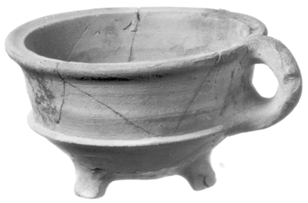 | 4b vorm | ronde vuurtest met scherpe knik bodem-wand en rand met aan bovenzijde een geultje, poten |