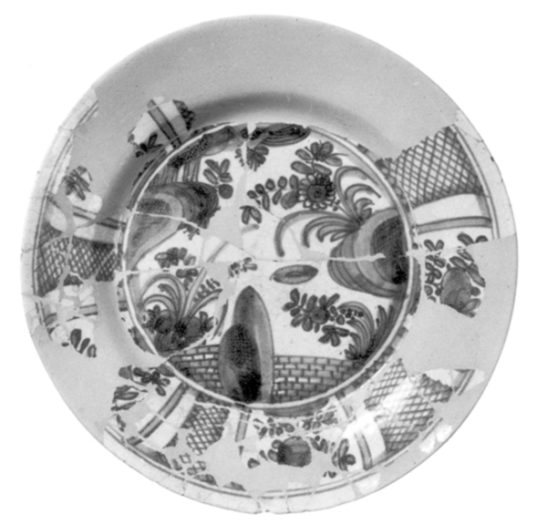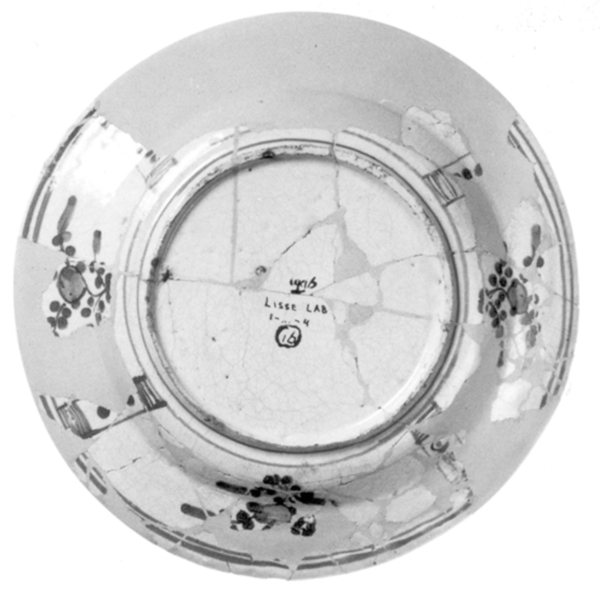 | 5c | blauwe beschildering, spiegel: landschap met bloemen, vlag: (boven- en onderzijde) aan kraakporselein ontleende vakverdeling met symbolen inwendig: blauw |