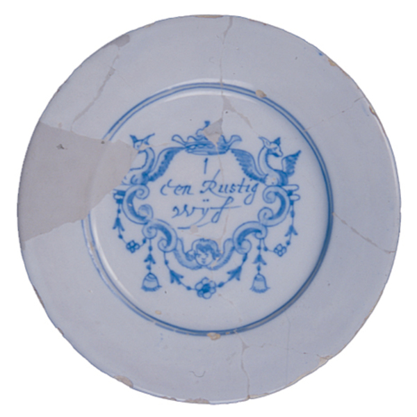 | 5c decoratie | spreuk binnen cartouche met grotesken: 1 een rustig wijf inwendig: blauw |