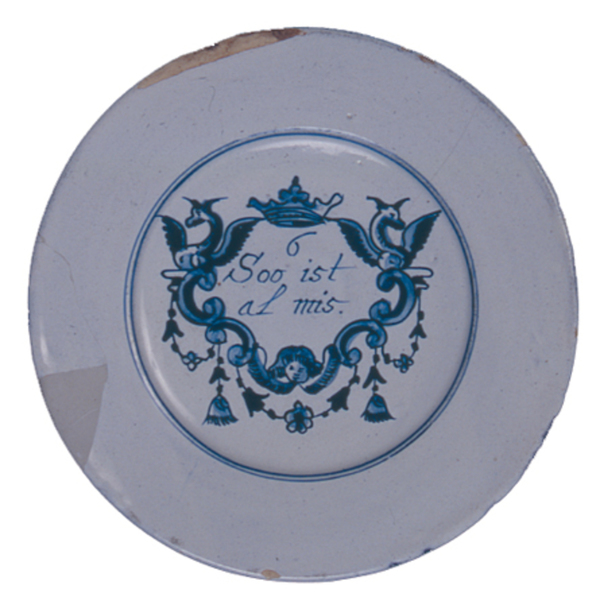 | 5c decoratie | spreuk binnen cartouche met grotesken: 6 Soo ist al mis blauw |