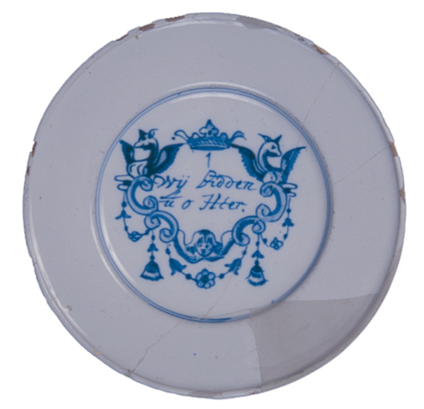 | 5c decoratie | spreuk binnen cartouche met grotesken: 1 Wij bidden u o Heer blauw |