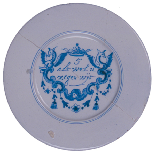 | 5d | drie penafdrukken op achterzijde, waarschijnlijk tijdens het bakken gebroken of gescheurd, gebruiksslijtage ontbreekt geheel De Porceleyne Fles |