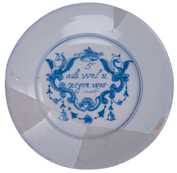 | 5c decoratie | spreuk binnen cartouche met grotesken: 5 als wel u zegen wijs blauw |