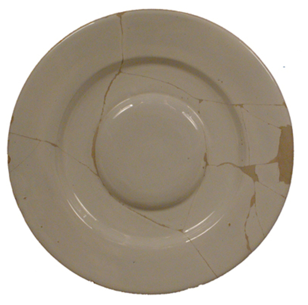 | 5d | drie penafdrukken op achterzijde, nauwelijks gebruiksslijtage, waarschijnlijk tijdens het bakken gescheurd dubbele doorboring in standring De Porceleyne Fles |