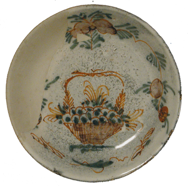 | 5c decoratie | voorzijde: gestileerde fruitmand met daaromheen bloemenranken polychroom |