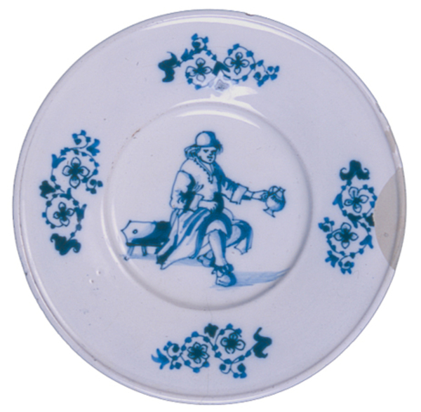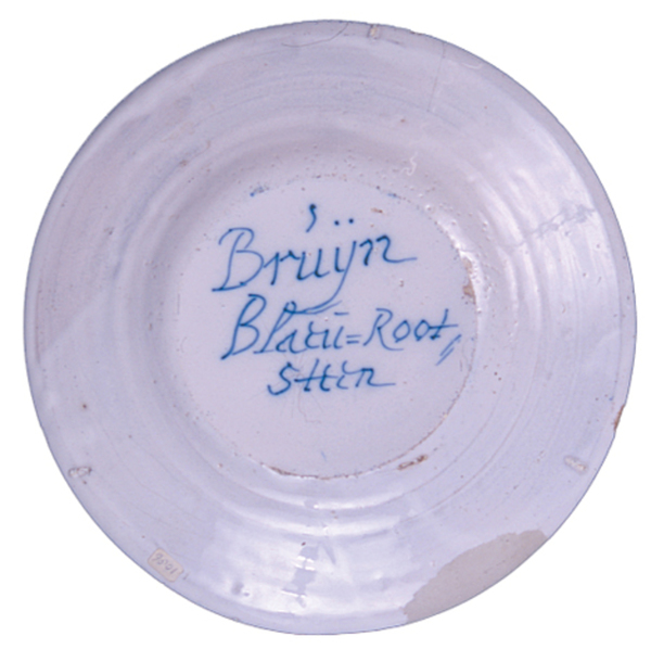 | 5c | spiegel: man met kan, vlag: vier bloemranken, achterzijde opschrift: Bruijn Blaeu=Root // Steen blauwe beschildering |