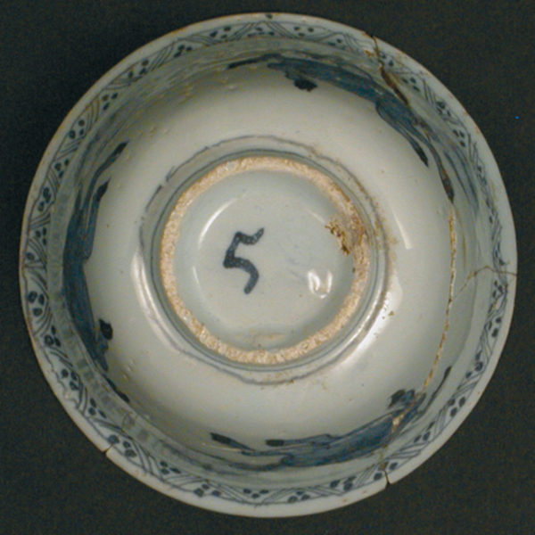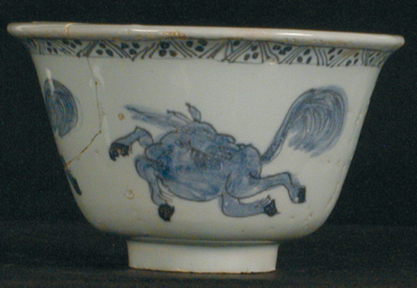 | 5c | uitwendig: drie vliegende paarden (imitatie kraakporselein) blauwe beschildering |